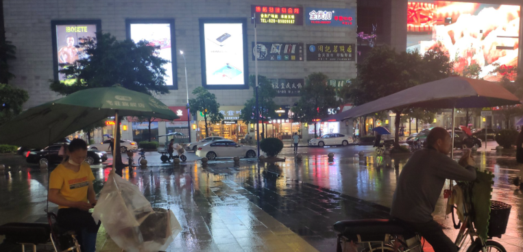 不知道是雨水给王哥充电,还是机器给小电驴充电。
